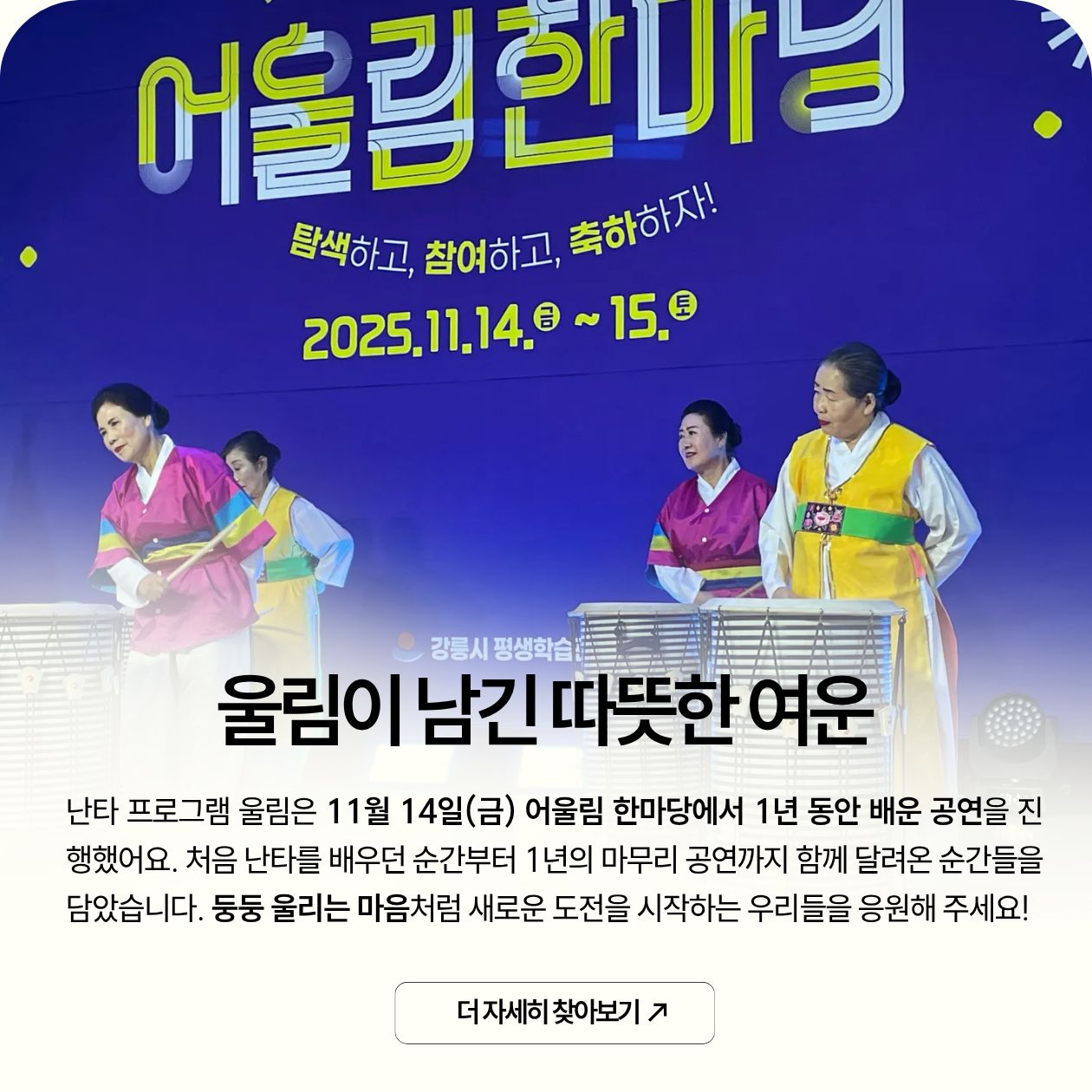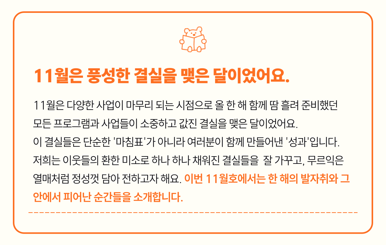 쌀쌀해진 11월, 주민들은 제철 음식(봄동, 굴, 김장)을 나누고, 다용도 정리함을 만들며 성취감을 공유했습니다. 무엇보다 11월이 특별했던 이유는 다 같이 원주 소금산 나들이를 다녀오며 조금 더 가까워지는 시간을 만들었어요. 음식, 만들기, 여행 등 모든 활동에서 '혼자보다 함께가 힘이 된다'는 의미를 되새긴 따뜻한 한 달이었습니다!