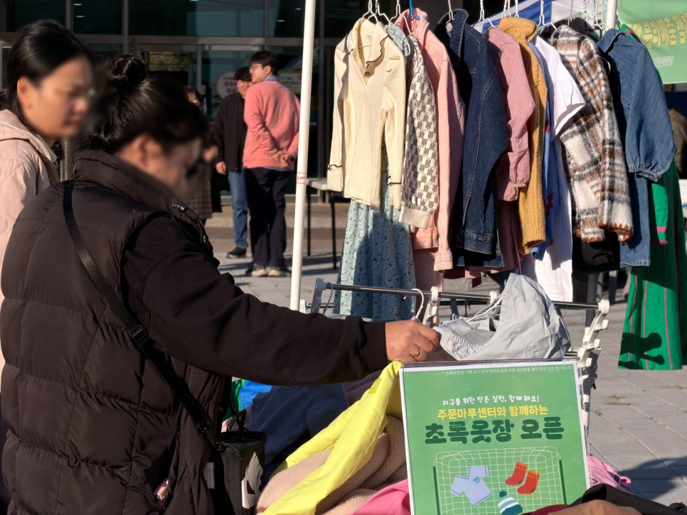 11월 21일 주문진읍사무소 광장에서 두 번째 초록옷장을 진행했습니다. '지구를 위한 작은 실천'이라는 마음으로 시작했던 초록옷장은 이제 주민들과 함께 만들어가는 우리 동네의 작은 순환 문화로 자리 잡아가고 있습니다. 지역주민과 봉사단체에서 기부해주신 의류부터 아이들이 주인이 된 키즈 프리마켓, 준비한 활동을 뽐낸 주민 동아리, 환경 캠페인까지 단순한 바자회가 아닌 생활 속의 실천을 배울 수 있었어요.