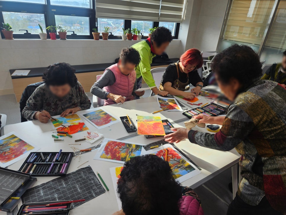 11월, 주문마루센터의 그림화방 미술 교실은 가을 풍경, 동양적 화병과 꽃, 건물 풍경, 원색 정물 등 다채로운 작품을 완성하며 참여자들의 실력이 눈에 띄게 성장했습니다. 특히, 이번 달에는 작품을 모아 주문진읍사무소 '초록옷장' 행사에 전시하여 주민들의 많은 관심도 받았습니다. 참여자들은 자신의 작품이 전시되는 기쁨을 나누었고, 서로를 돕는 따뜻한 공동체의 모습도 보였습니다. 혼자서는 벅차던 그림이 이제는 함께 나누는 즐거움과 성장의 증거가 된 소중한 한 달이었습니다!