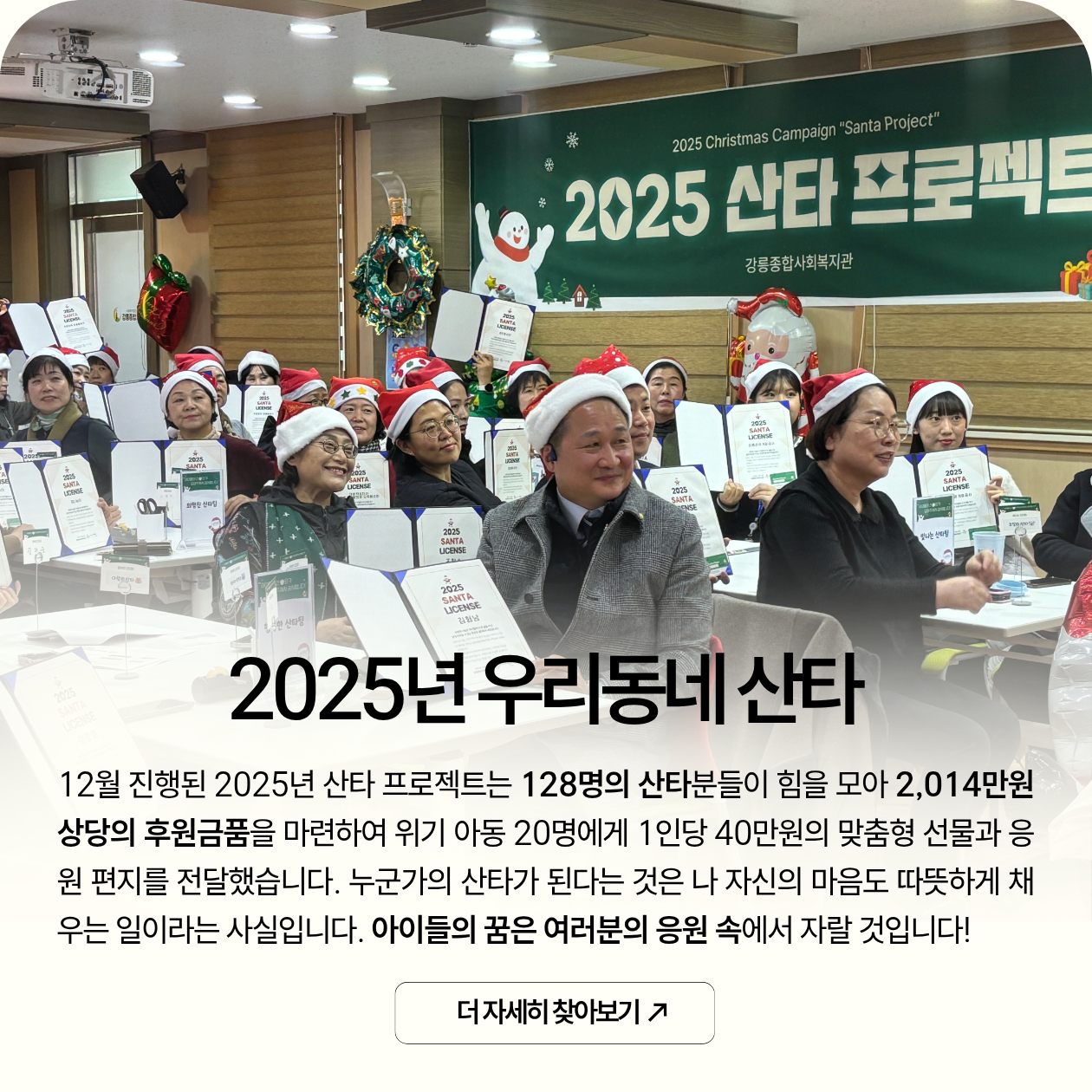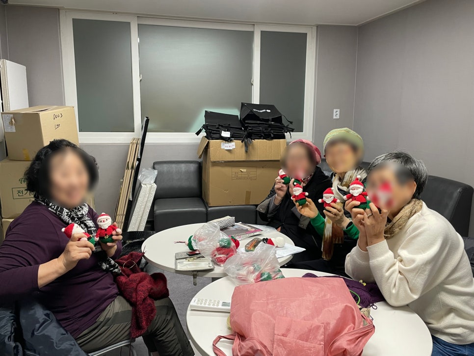 올해 활동을 마무리한 우리동네 뜨개방 주민들이 연말 산타 프로젝트를 위해 다시 한 번 뭉쳤습니다. 촉박한 일정이었지만 주민들은 아이들에게 선물할 산타 키링 인형을 위해 뜨개질에 몰입해 주셨어요. 12월 17일 산타 발대식 날 정성껏 만들어낸 동글동글하고 귀여운 산타 인형들이 한자리에 모여 나눔의 의미를 더했습니다. '우리동네 뜨개방'은 이제 주민동아리 활동으로 전환되어 더 다양한 활동을 진행할 예정입니다. 뜨개를 통해 마을에 온기를 전하고 싶은 분들은 2026년 모집을 시작할 뜨개동아리에 많은 관심과 신청 부탁드립니다.