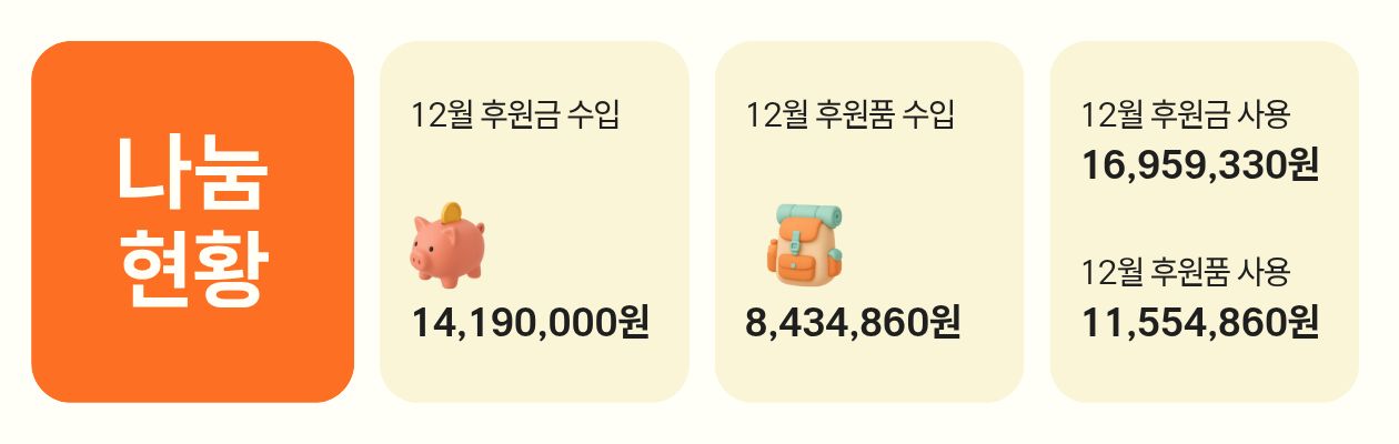 추워진 날씨에 겨울철을 잘 지낼 수 있도록 시멘트산업사회공헌재단과 (주)동화가든원조짬순, 현대자동차 강릉하이테크센터의 후원으로 김장김치, 온열매트, 순두부 밀키트를 지원할 수 있었습니다. 또한 지역 내 사각지대 발굴을 위해 읍면동 주민센터의 추천으로 선정하여 따뜻한 물품을 전달할 수 있었습니다.