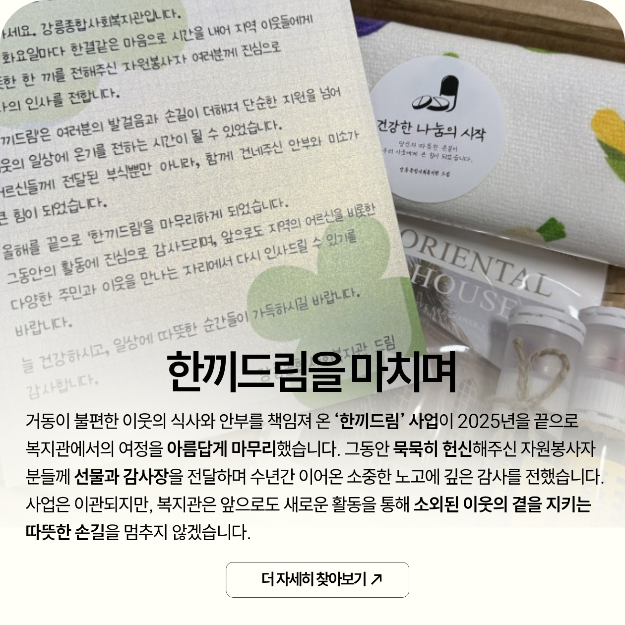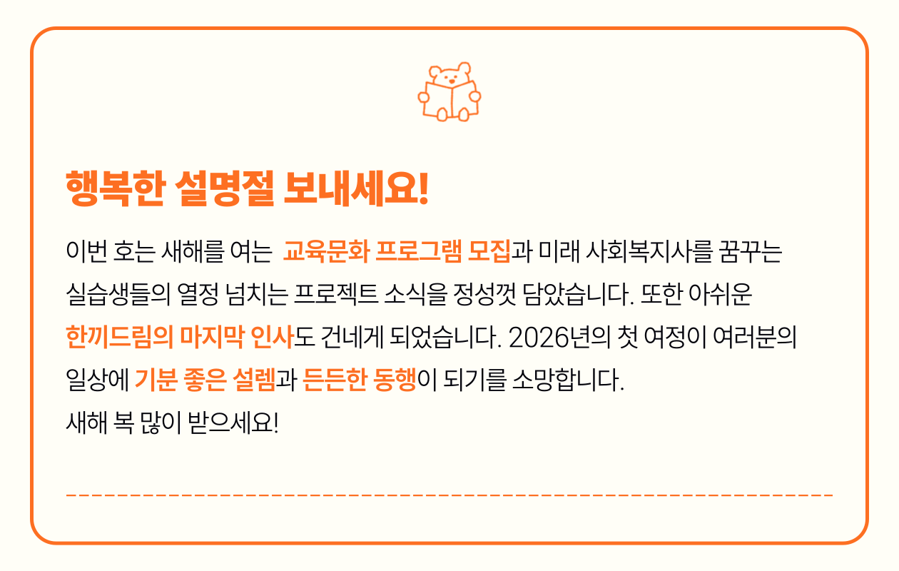 실습생들은 주민들에게 한 걸음 더 다가가기 위해 직접 기획한 단기 프로젝트 ‘놀면 뭐하니?’를 통해 3회기 동안 웃음꽃을 피웠습니다. 함께 이름표를 꾸미고 신명 나는 윷놀이를 즐기는 사이, 서먹했던 첫 만남은 어느새 서로의 이름을 부르는 다정한 이웃의 정으로 깊어졌습니다. 짧은 만남이었지만 실습생들의 진심과 어르신들의 환한 미소가 어우러진 이번 시간은 모두의 마음속에 오래도록 잊지 못할 추억으로 남을 것입니다.