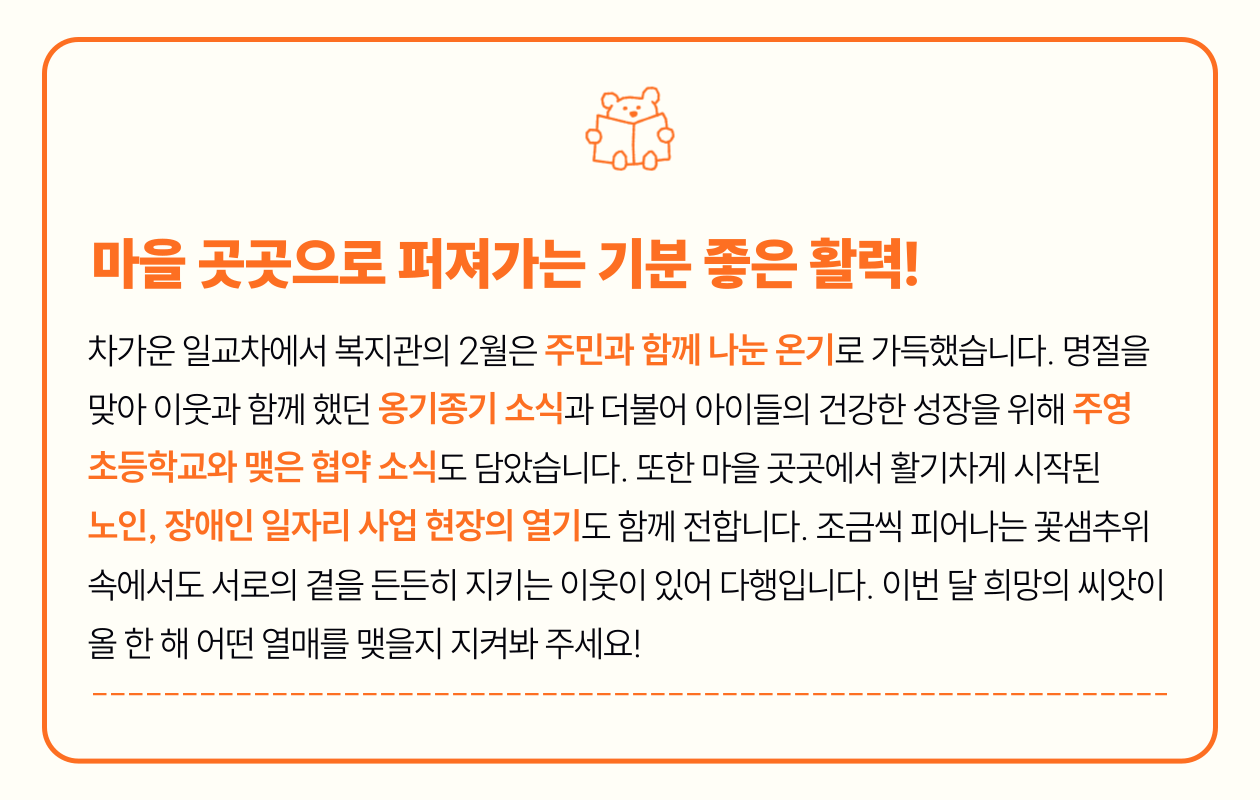 꽃샘추위가 찾아온 2월 말, 강릉종합사회복지관과 주영초등학교가 주문진 지역 아동들의 건강한 성장을 위해 손을 맞잡았습니다. ‘아이 한 명을 키우려면 온 마을이 필요하다’는 마음으로, 학교와 복지관은 앞으로 맞춤형 복지 지원부터 다채로운 교육 프로그램까지 함께 고민하고 실천하기로 했습니다. 아이들이 지역사회의 따뜻한 보살핌 속에서 마음껏 꿈을 펼칠 수 있도록, 학교와 마을이 함께 걷는 이 소중한 발걸음을 응원해 주세요!