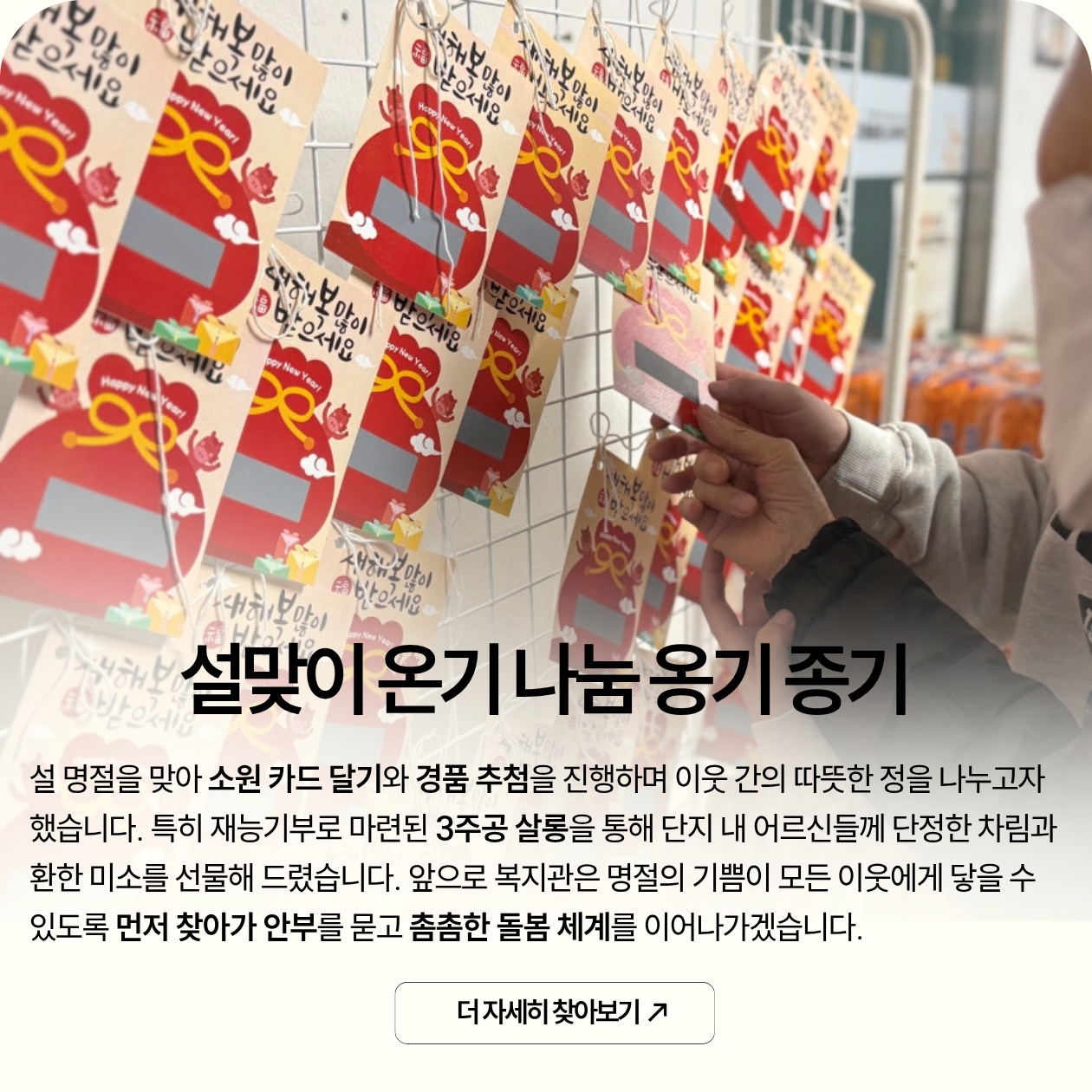 씨앗을 뿌리는 농부의 마음으로 복지관의 가치를 지역사회에 심어가기 위한 후원 체계를 재점검했습니다. 주민들이 나눔에 더 쉽고 즐겁게 참여할 수 있도록 홈페이지와 신청 시스템을 개선하고, 변화된 이웃의 이야기를 담은 다정한 후원 안내서를 새롭게 준비하고 있습니다. 앞으로도 복지관은 더 자주 주민들을 만나며, 후원이 단순한 기부를 넘어 우리 마을을 스스로 돌보는 따뜻한 문화로 자리 잡을 수 있도록 전문적인 실천을 이어가겠습니다.